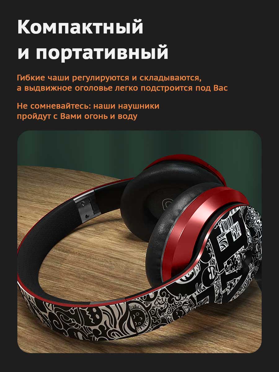 Дерзкие новые беспроводные наушники, с нанесенным вручную красивым принтом в стиле граффити, никого не оставят без внимания и создаст красочную атмосферу и поднимет настроение вам и окружающим. То, что нужно современному жителю мегаполиса – комфорт, функционал и обалденный дизайн!
