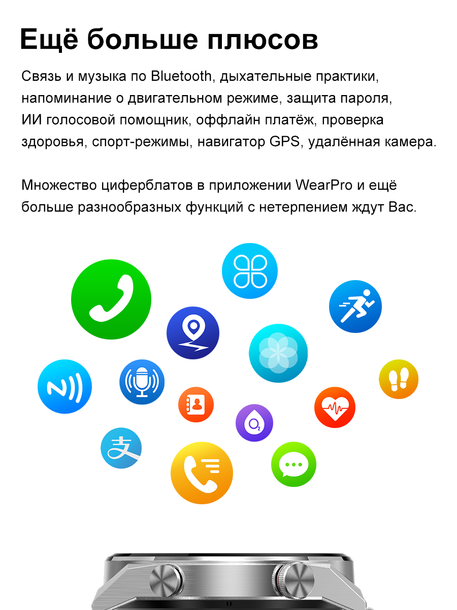 - Сменные циферблаты (+ загрузка из приложения WearPro)