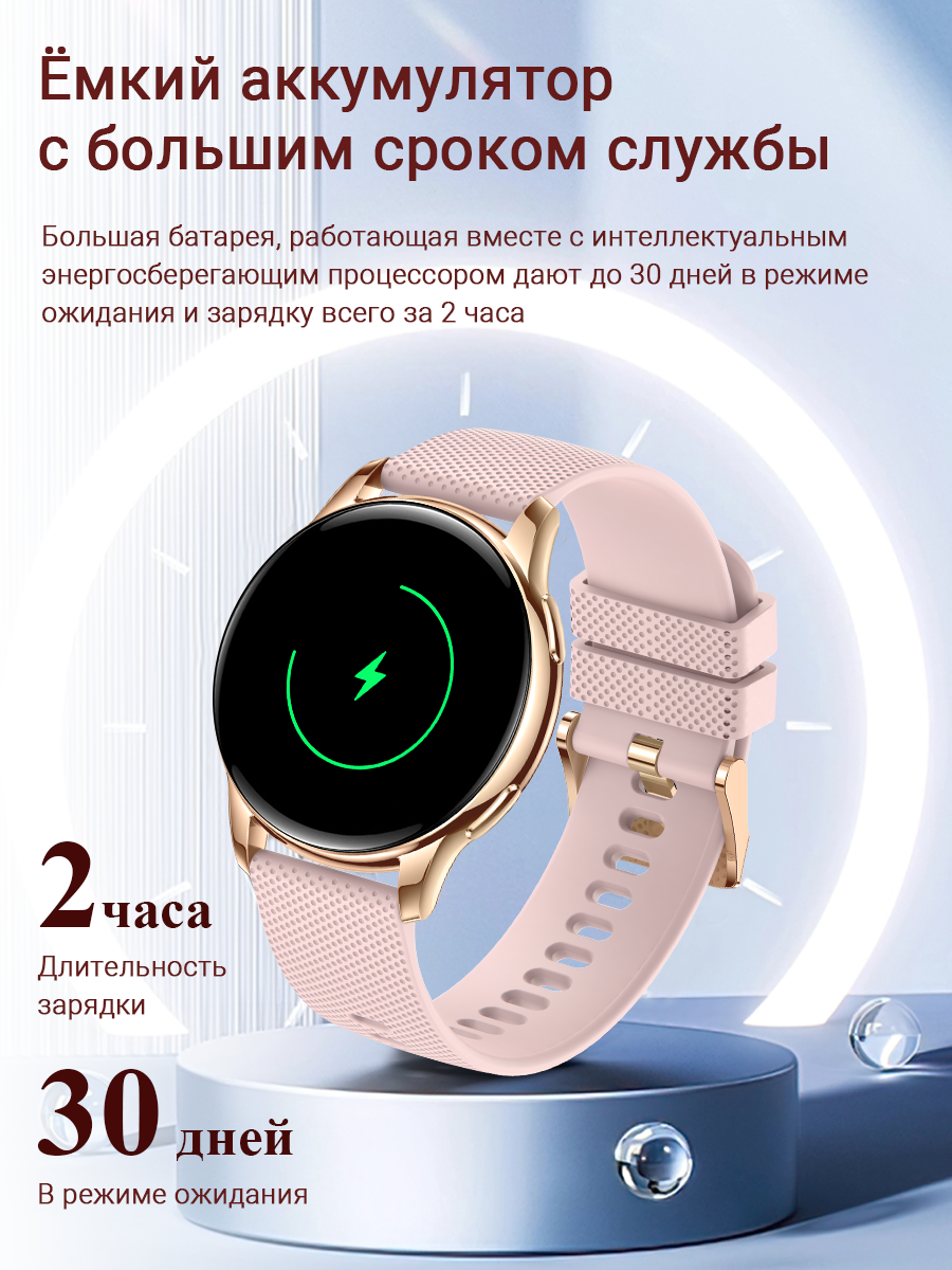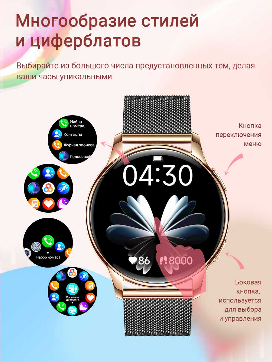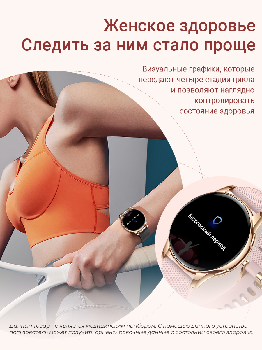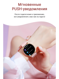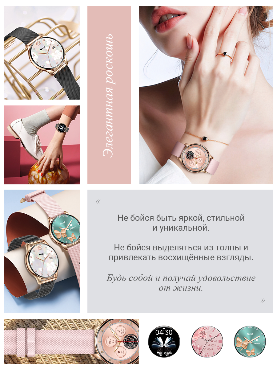 • Модель умных часов сочетает в себе современный и деликатный дизайн, сочетающий в себе практичность и легкость. Толщина корпуса всего 11 мм. Смарт-часы комплектуются двумя ремешками: элегантным металлическим для особых случаев и удобным силиконовым для повседневного использования.
