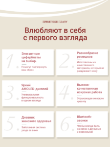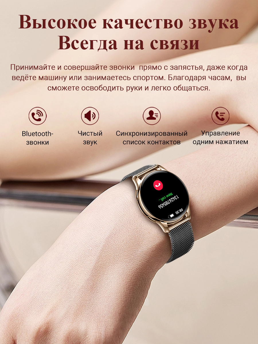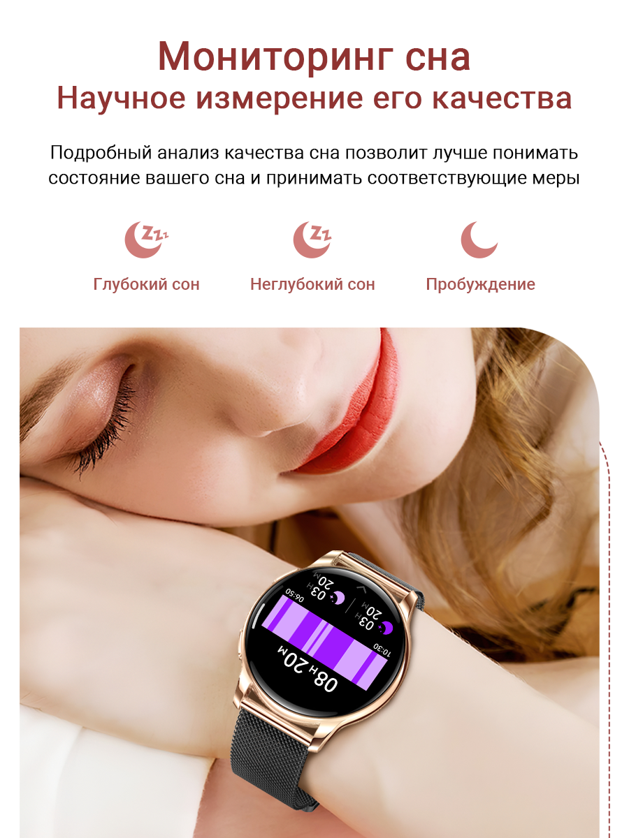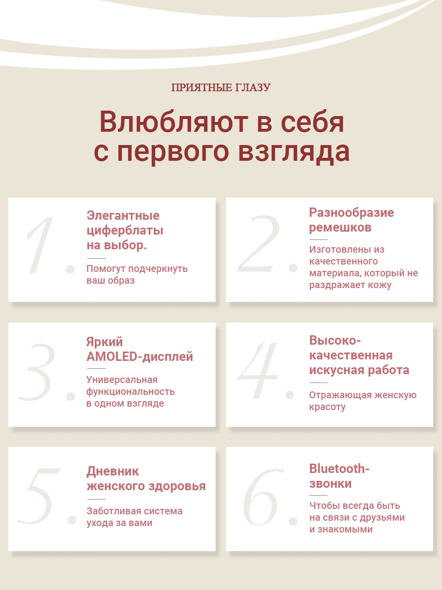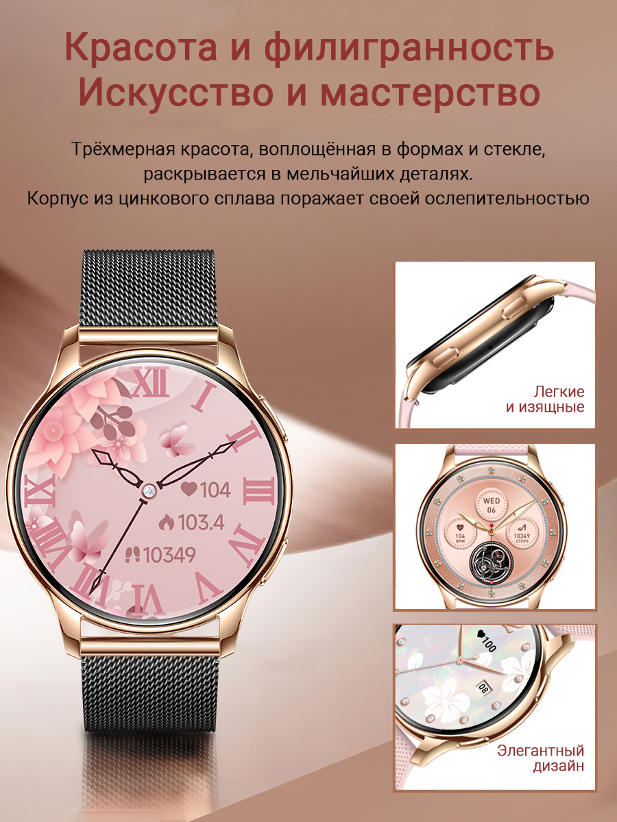 • Модель умных часов сочетает в себе современный и деликатный дизайн, сочетающий в себе практичность и легкость. Толщина корпуса всего 11 мм. Смарт-часы комплектуются двумя ремешками: элегантным металлическим для особых случаев и удобным силиконовым для повседневного использования.