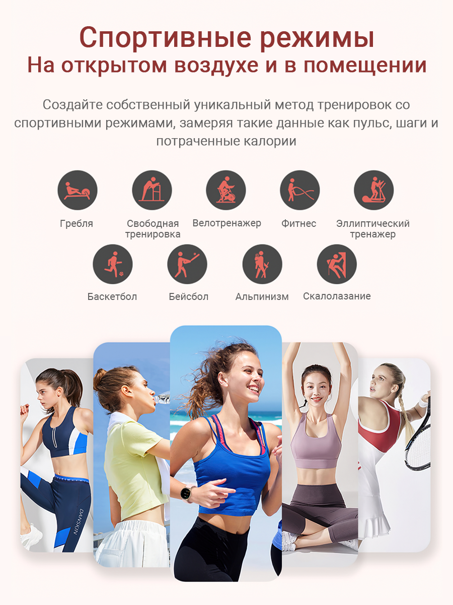 • 19 предустановленных спортивных режимов активности (ходьба, бег, велоспорт, скалолазание, йога, баскетбол, скакалка, эллиптические упражнения и другие)