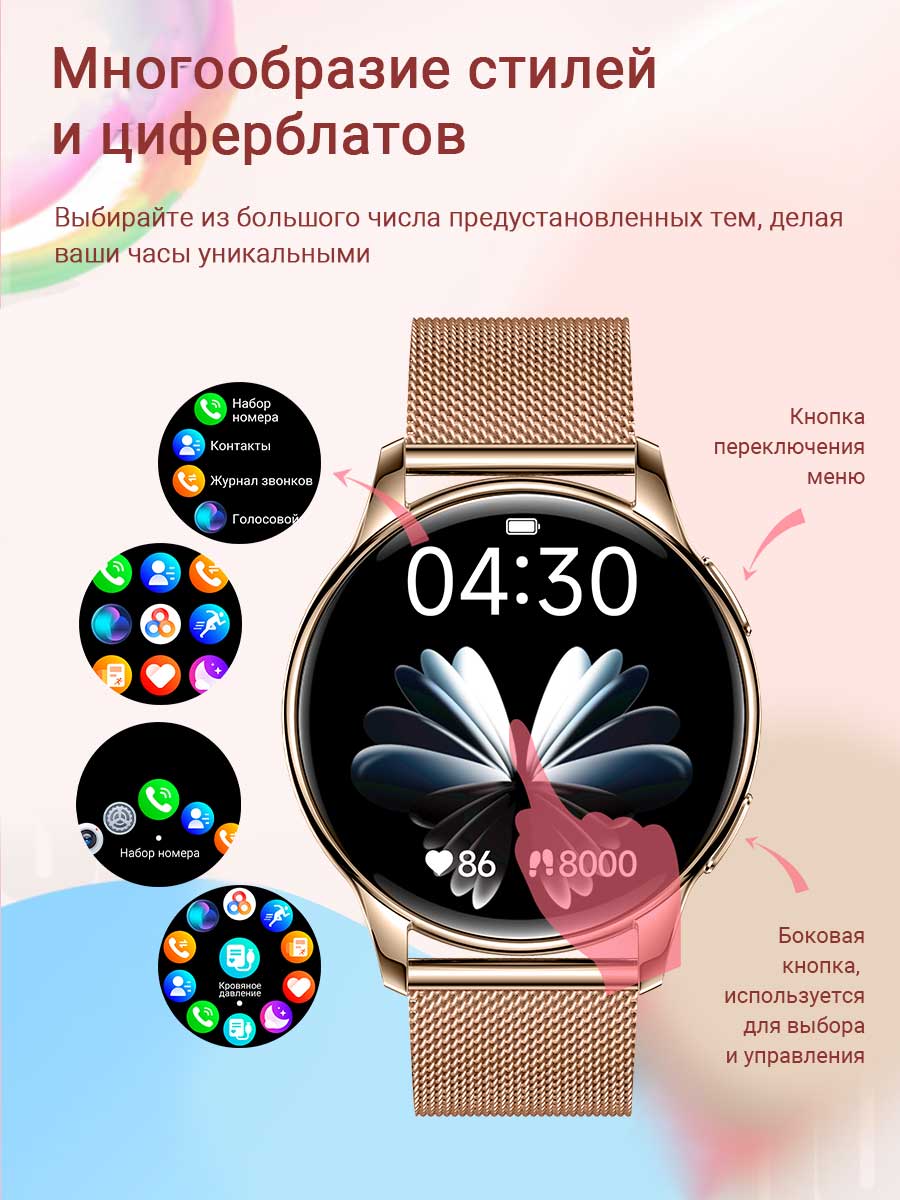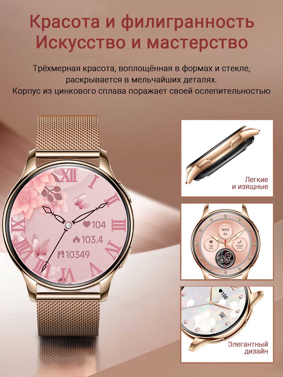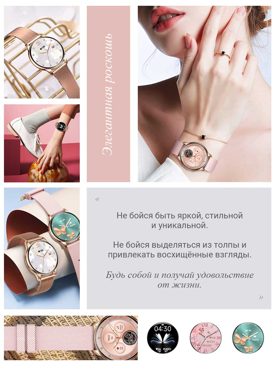 • Модель умных часов сочетает в себе современный и деликатный дизайн, сочетающий в себе практичность и легкость. Толщина корпуса всего 11 мм. Смарт-часы комплектуются двумя ремешками: элегантным металлическим для особых случаев и удобным силиконовым для повседневного использования.