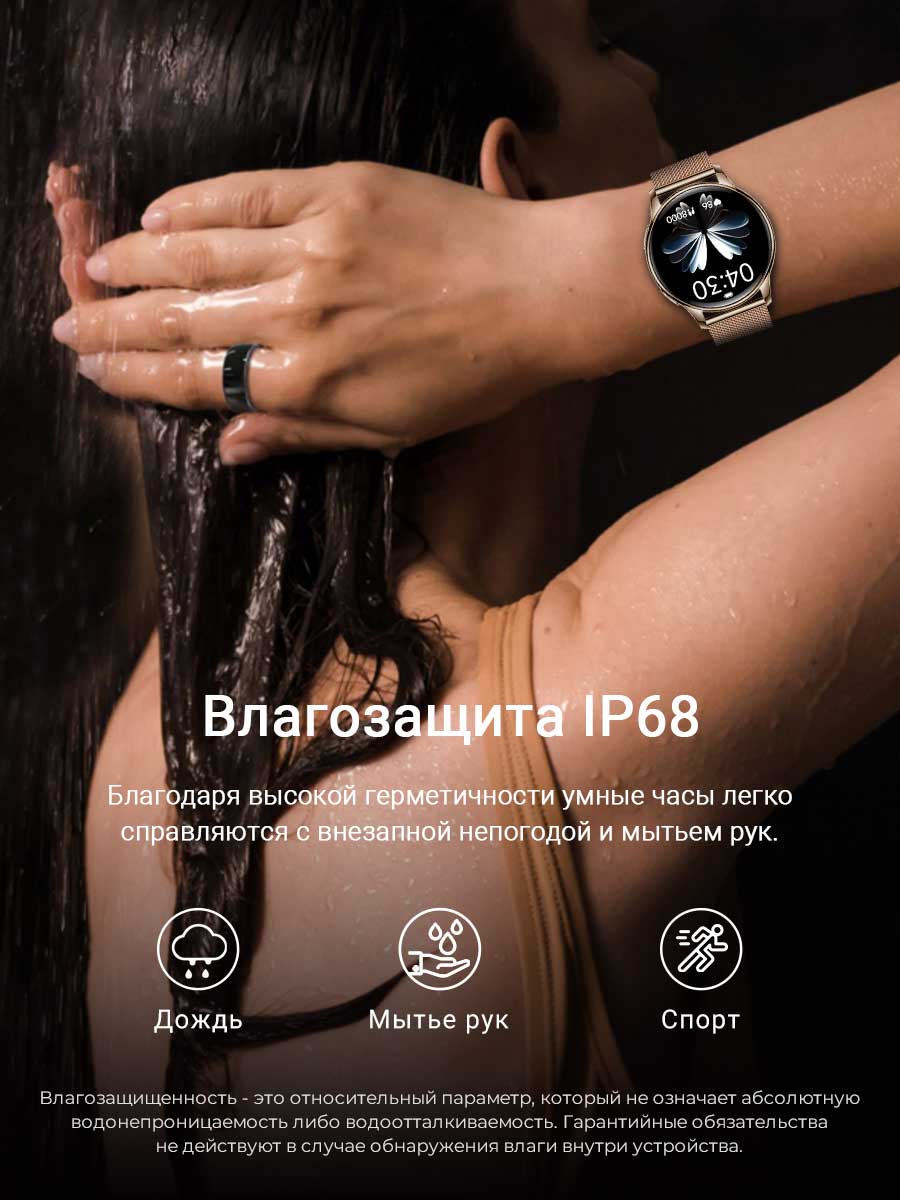 Степень влагозащиты в часах IP68, это подразумевает полное погружение под воду до 30 минут. Соблюдая условия рейтинга IP68, в часах можно плавать без вреда для устройства. Устойчивость к воздействию влаги и пыли не является постоянной и может снижаться при естественном износе.