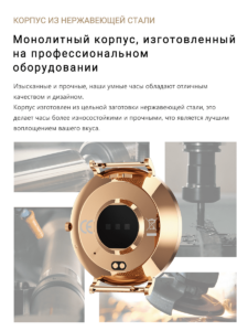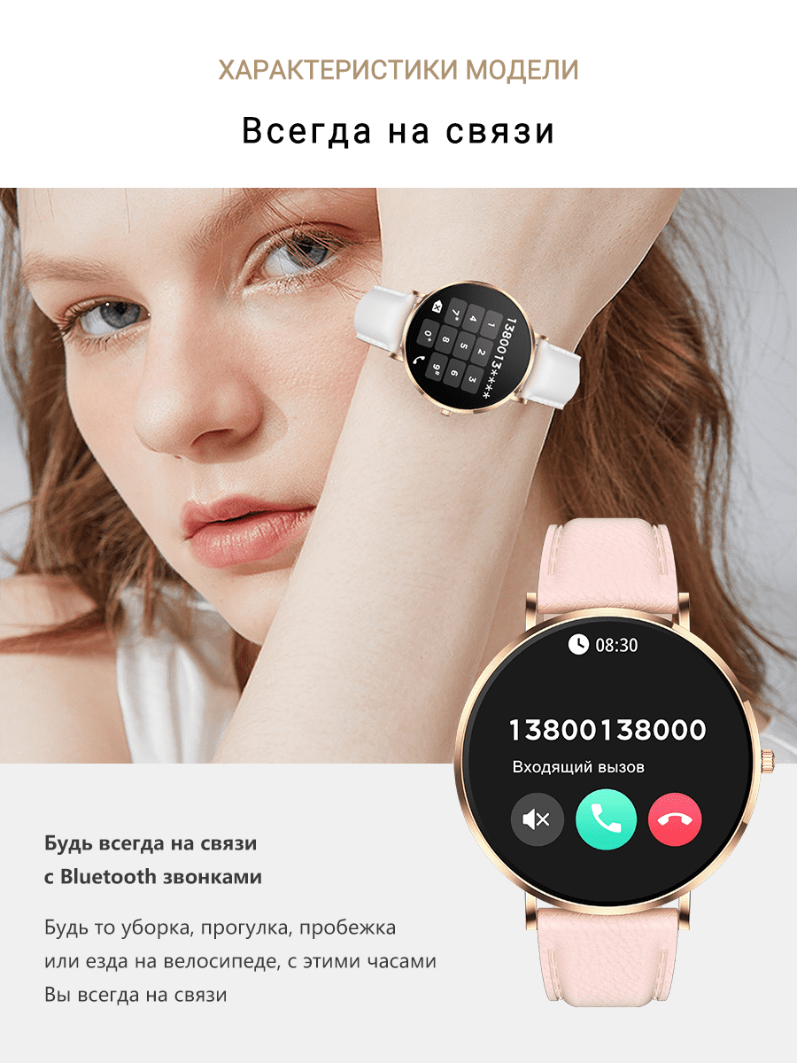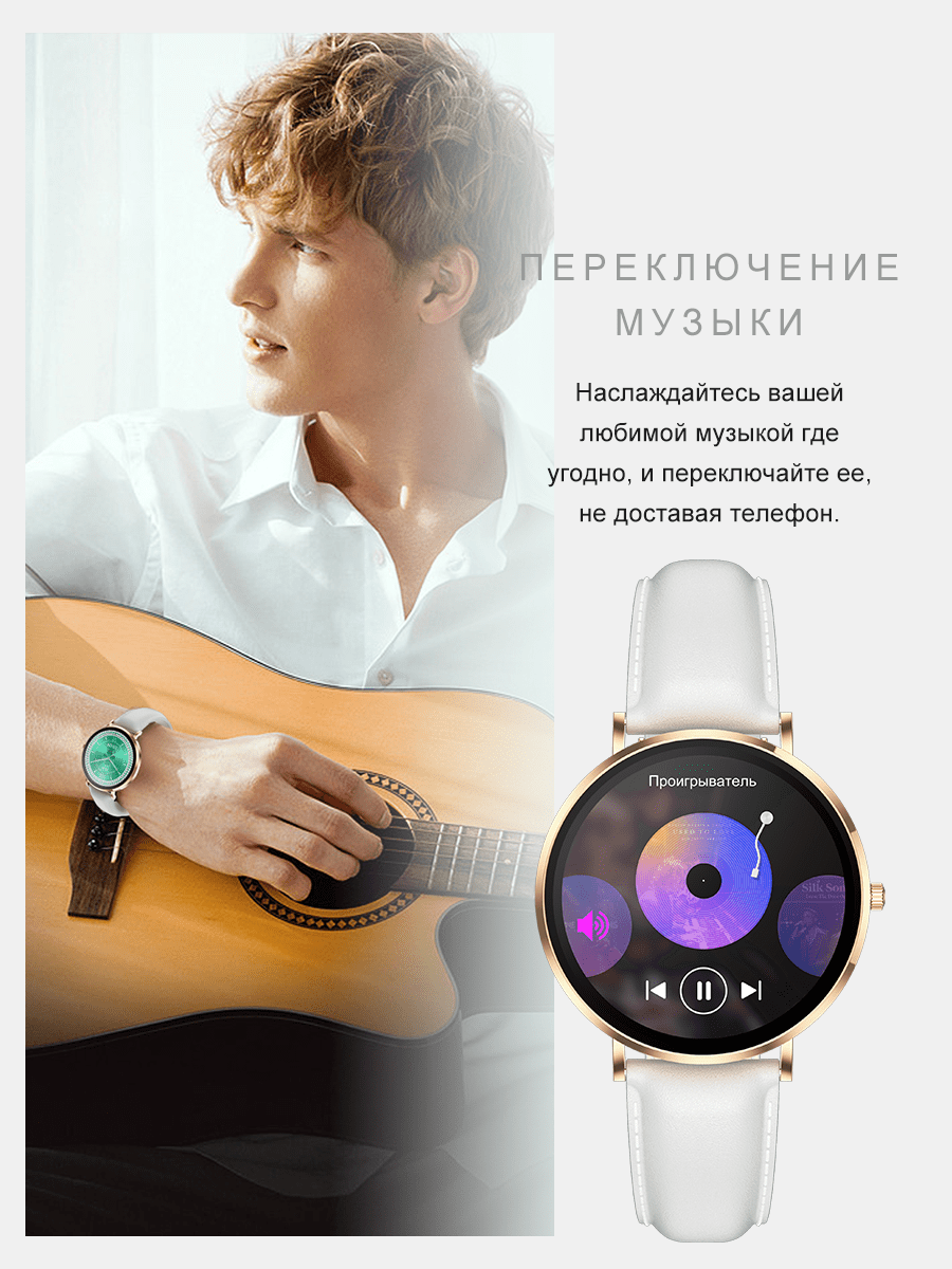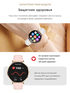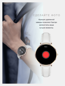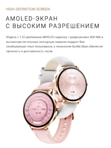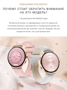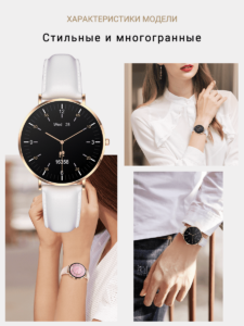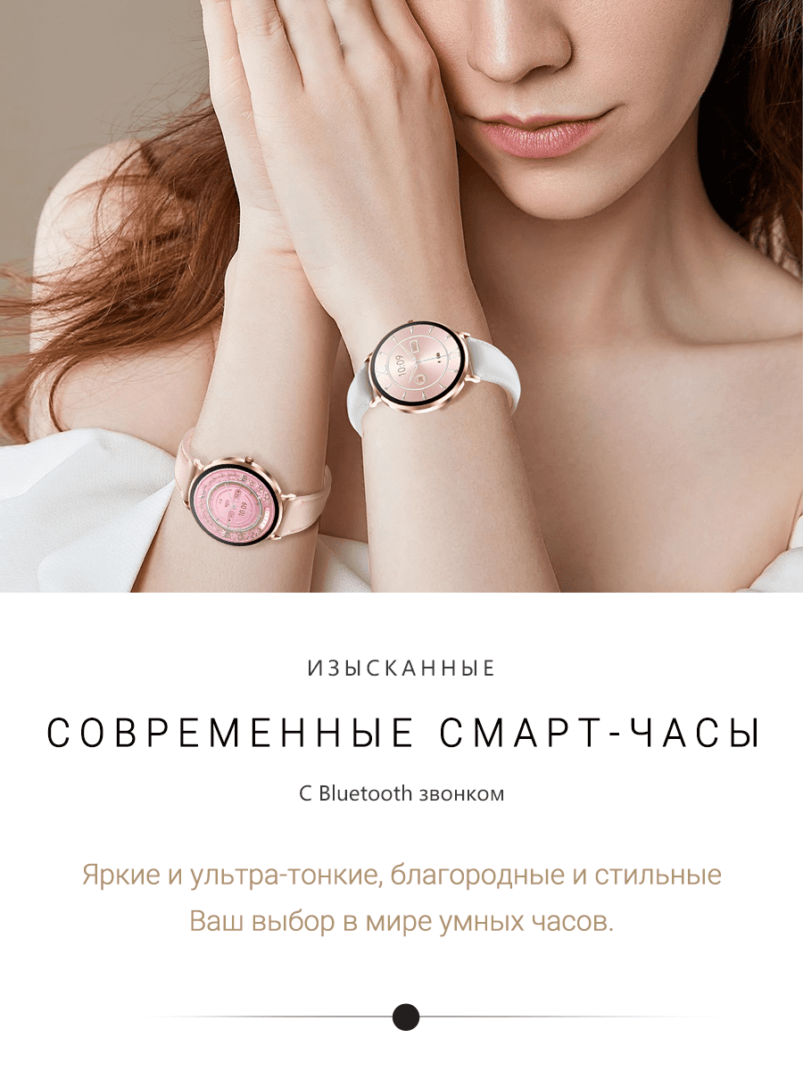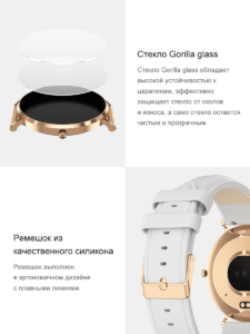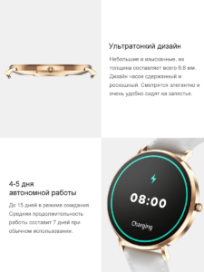 Модель умных часов сочетает в себе современный и деликатный дизайн, сочетающий в себе практичность и легкость. Толщина корпуса всего 6.8 мм. Смарт-часы комплектуются двумя ремешками: элегантным мягким кожаным и удобным силиконовым для повседневного использования.