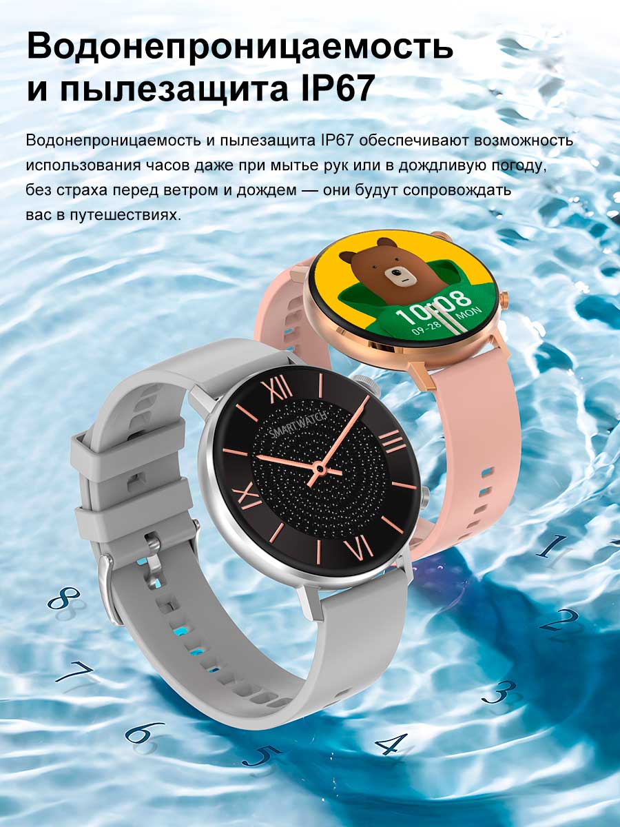 - Смарт-часы оснащены водонепроницаемым корпусом и ремешком, который представлен в 2-х вариантах: металлический серебристый и металлический золотистый.