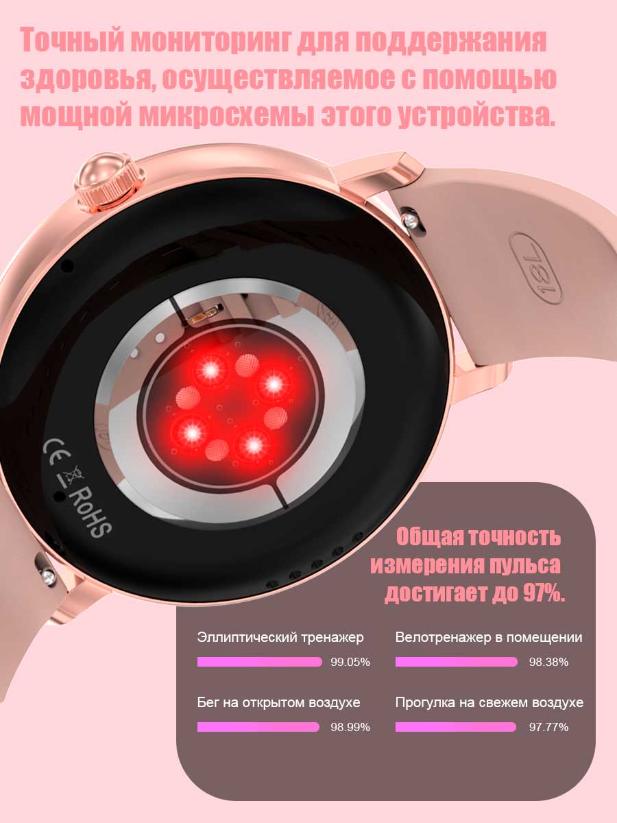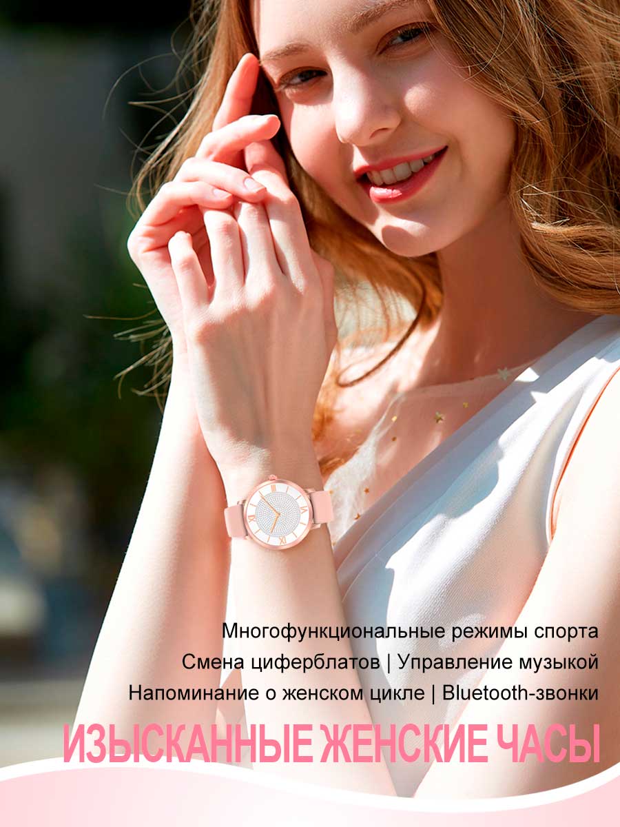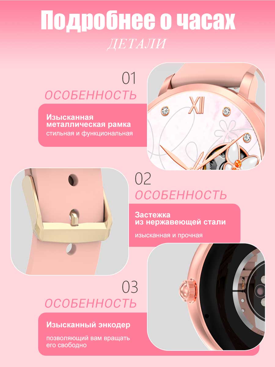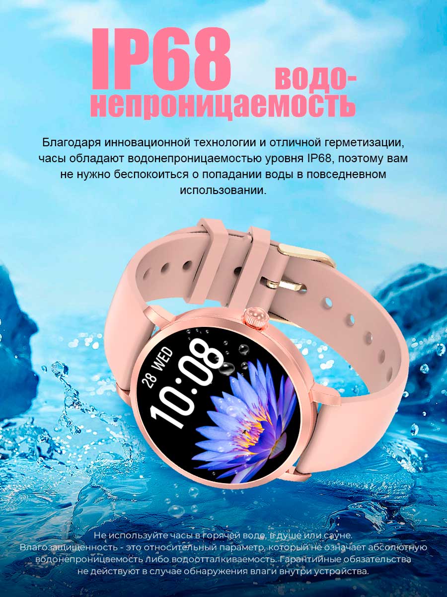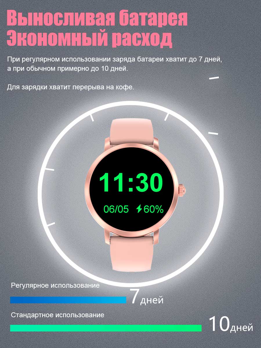 - Смарт-часы оснащены водонепроницаемым корпусом и силиконовым ремешком, которые представлены в 2-х вариантах: металлический серебристый и металлический золотистый.