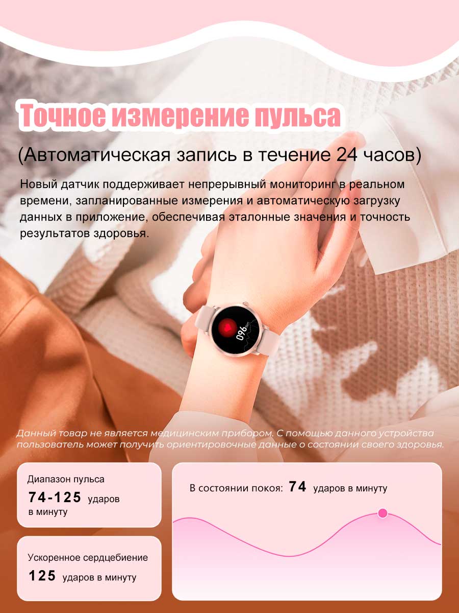 *Данный товар не является медицинским изделием и не подходит для выполнения медицинской диагностики. С помощью данного прибора пользователь может получить ориентировочные данные о состоянии своего здоровья. Снятие показаний происходит посредством оптического датчика и использует технологию неинвазивного скринингового метода - фотоплетизмографию.