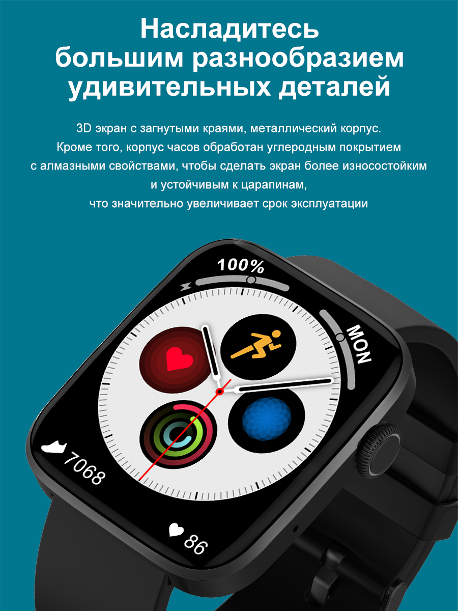 - Смарт-часы оснащены водонепроницаемым корпусом и ремешком, который представлен в 2ух вариантах: металлический (черный и серебристый цвет) и силиконовый (черный и серебристый цвет).