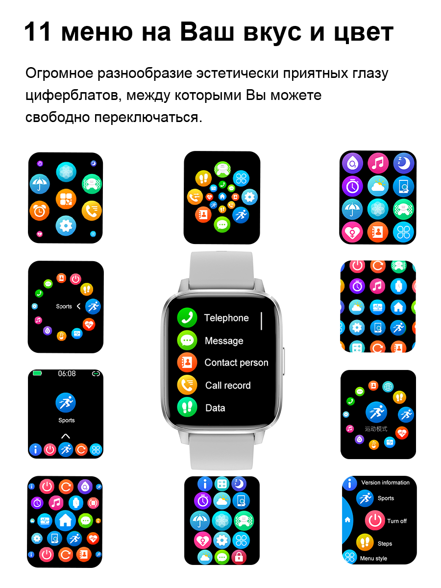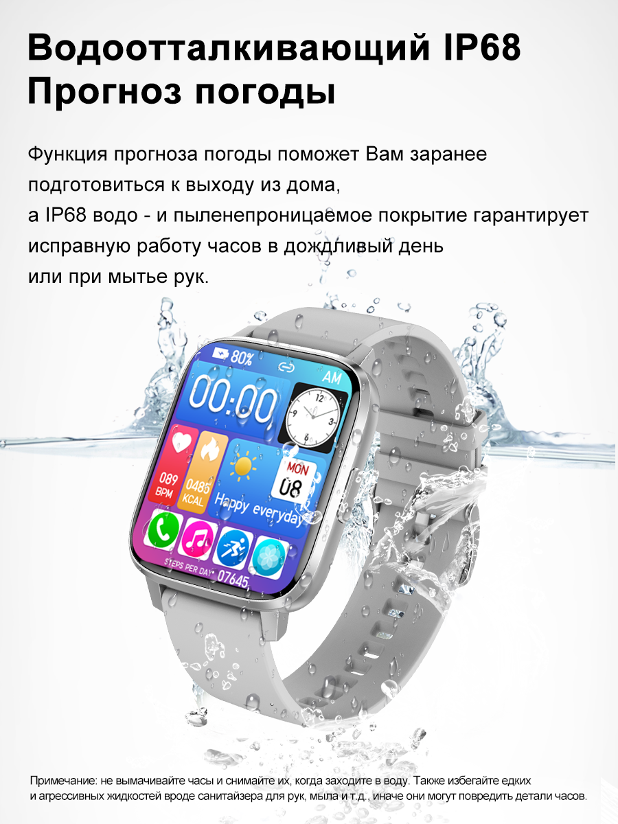• Смарт-часы оснащены водонепроницаемым корпусом и ремешком, который представлен в 2ух вариантах: металлический (черный и серебристый цвет) и силиконовый (черный и серебристый цвет).