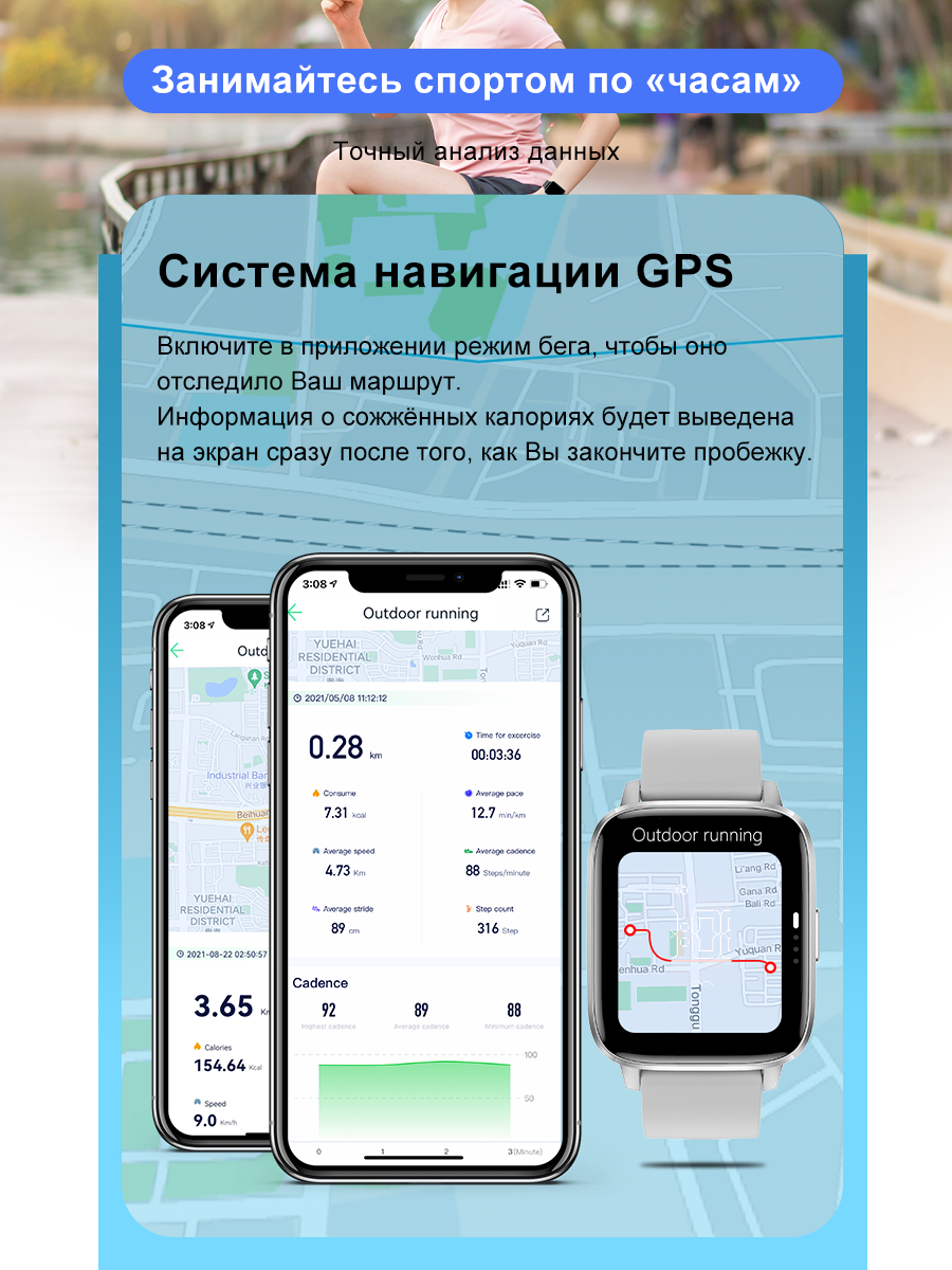• Шагомер, отслеживание пройденного расстояния, кол-во потраченных калорий