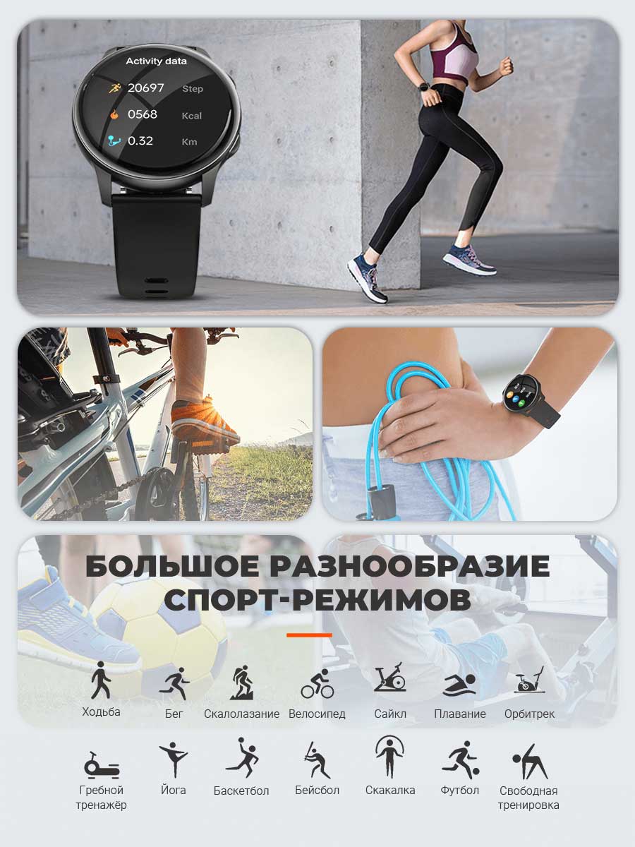 • 14 спортивных режимов активности (ходьба, бег, велоспорт, сайкл, плавание, скалолазание, гребной тренажер, йога, баскетбол, бейсбол, футбол, скакалка, эллиптические упражнения, свободная тренировка)