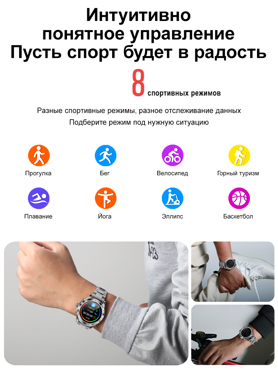• 8 спортивных режимов активности (ходьба, бег, велоспорт, скалолазание, йога, баскетбол, скакалка, эллиптические упражнения)
