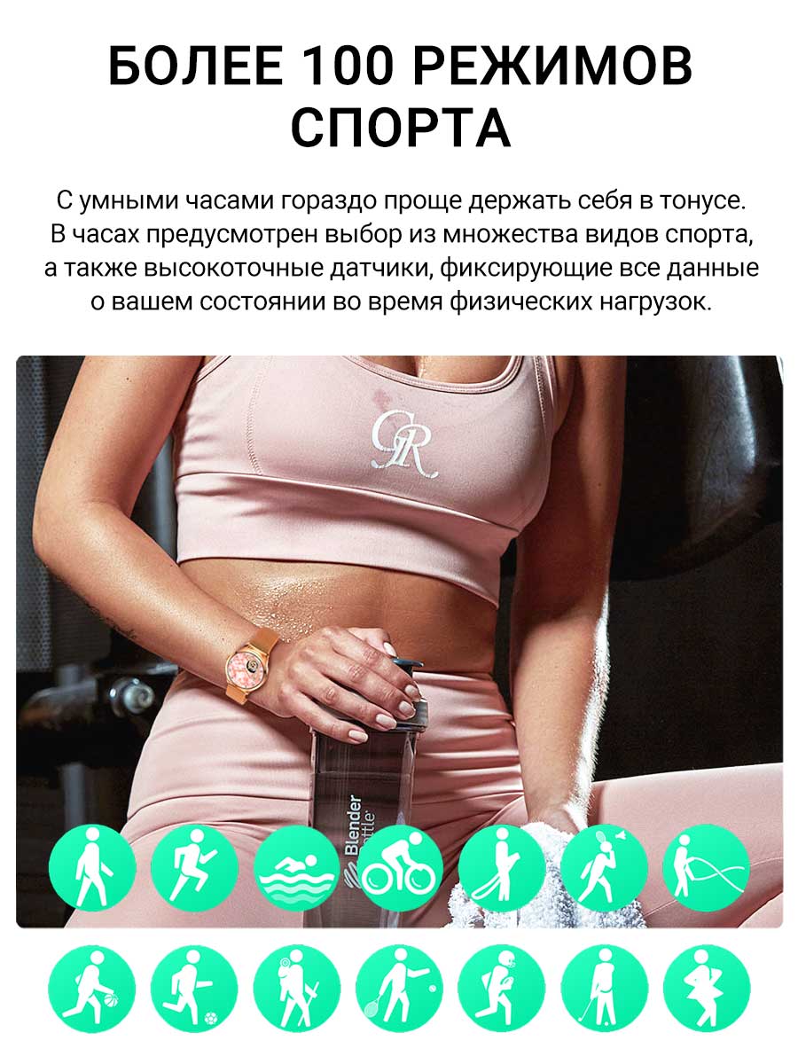 - 14 предустановленных спортивных режимов активности (ходьба, бег, велоспорт, скалолазание, йога, баскетбол, скакалка, эллиптические упражнения и другие)