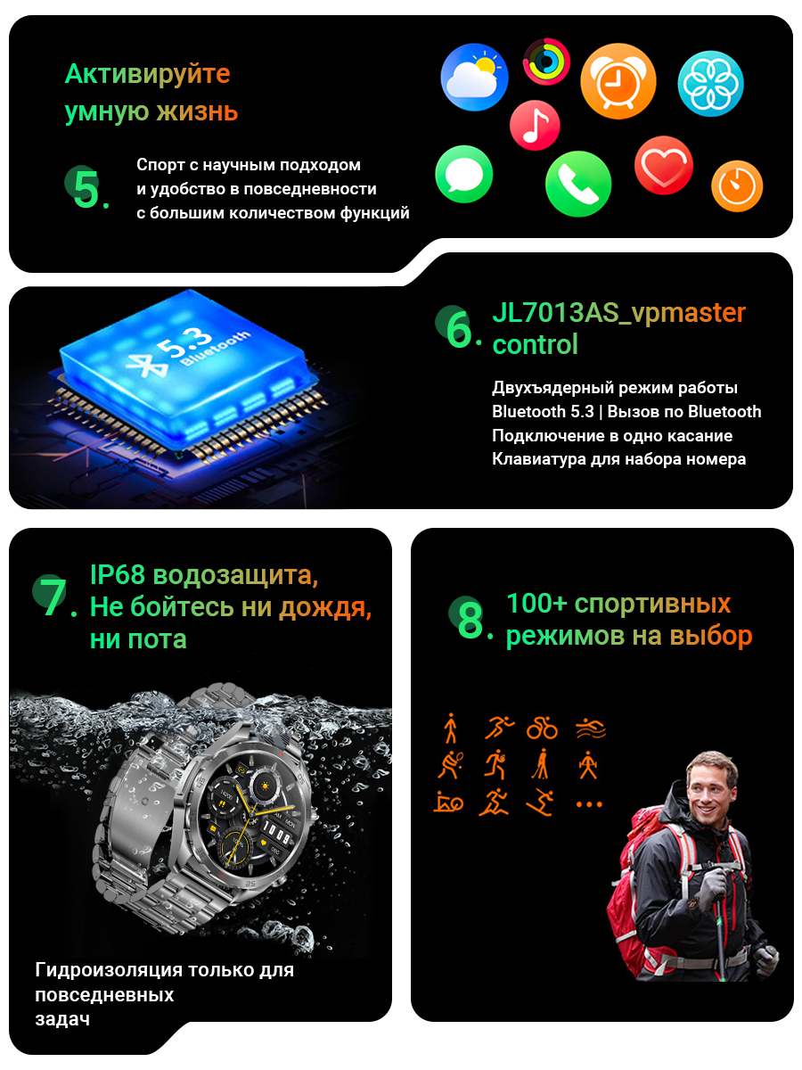 • 10 предустановленных спортивных режимов активности (ходьба, бег, велоспорт, скалолазание, йога, баскетбол, скакалка, эллиптические упражнения и другие)