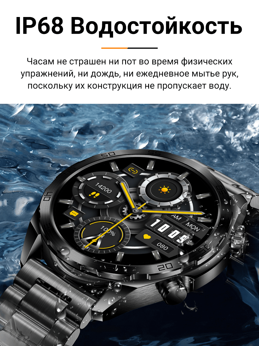Степень влагозащиты в часах IP67, это подразумевает полное погружение под воду до 30 минут. Соблюдая условия рейтинга IP68, в часах можно плавать без вреда для устройства. Устойчивость к воздействию влаги и пыли не является постоянной и может снижаться при естественном износе.