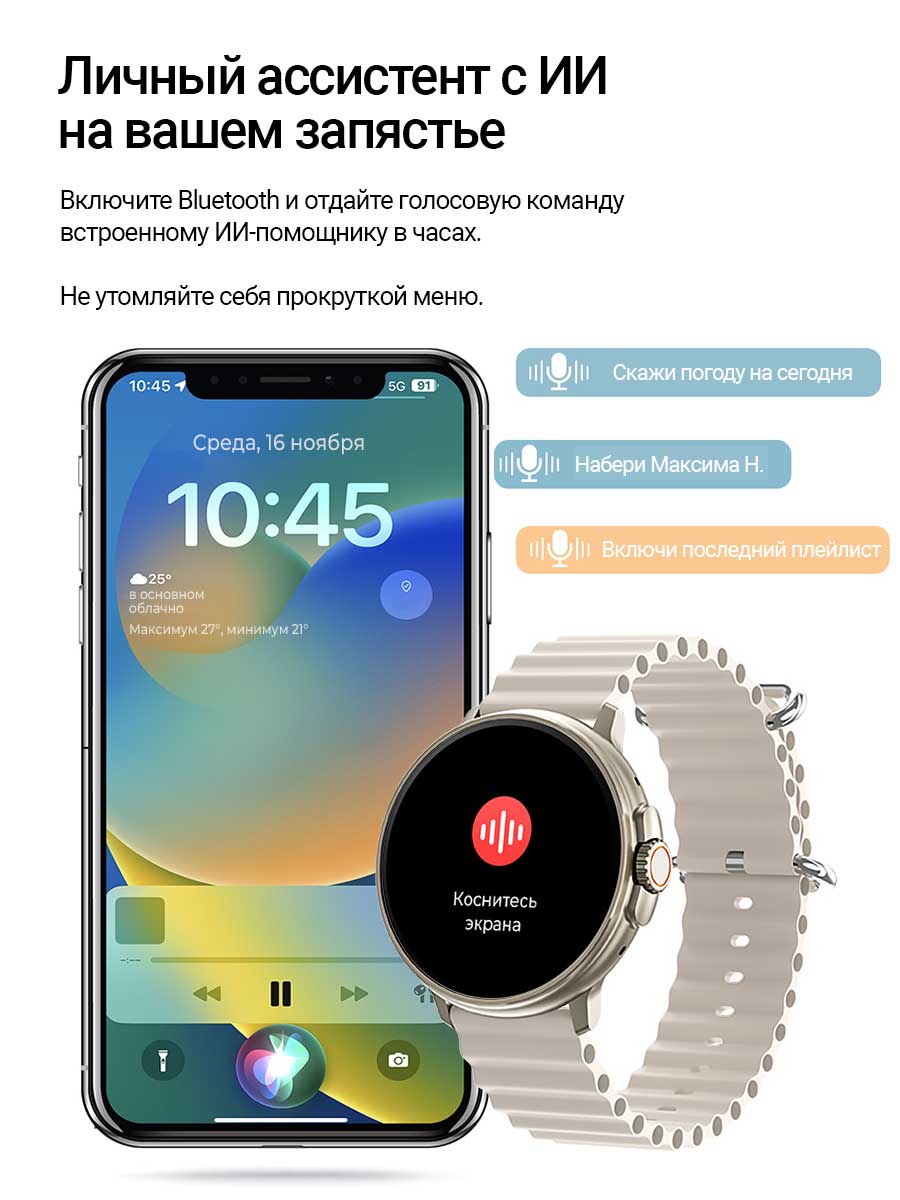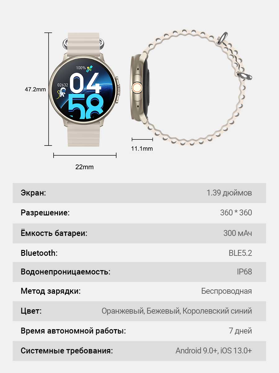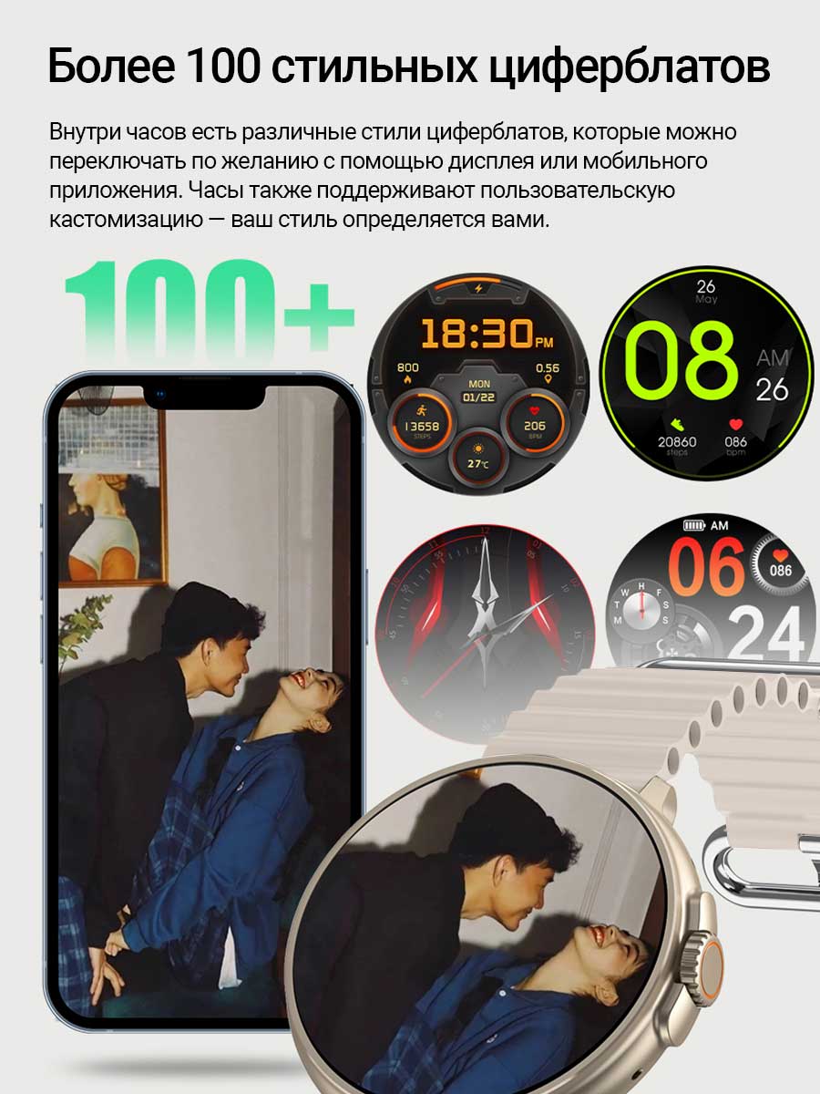 - Модель умных часов сочетает в себе современный дизайн и функциональность, сочетающий в себе практичность и надежность. Существенно большой экран часов с возможностью смены циферблатов для создания уникальности и выражения личного стиля.