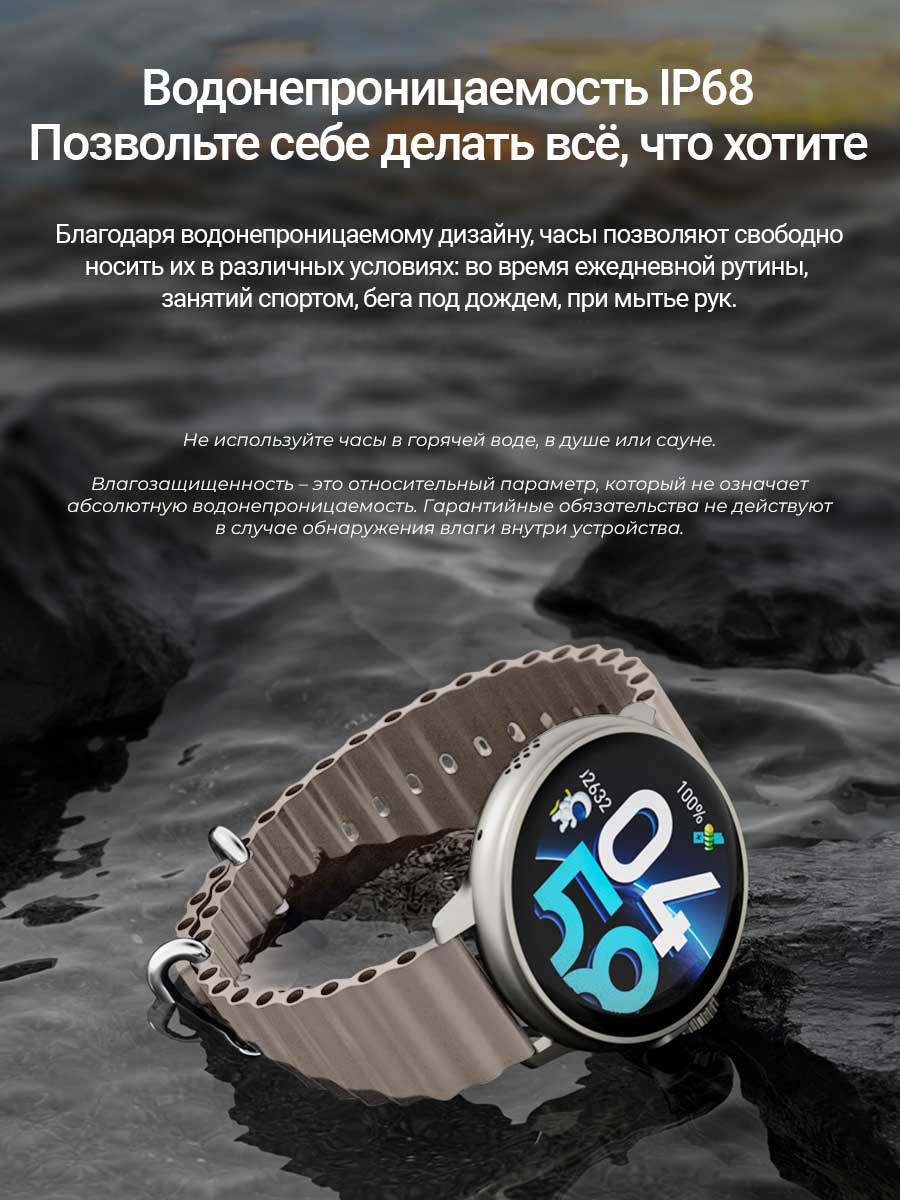 Степень влагозащиты в часах IP68, это подразумевает полное погружение под воду до 30 минут. Соблюдая условия рейтинга IP68, в часах можно плавать без вреда для устройства. Устойчивость к воздействию влаги и пыли не является постоянной и может снижаться при естественном износе.